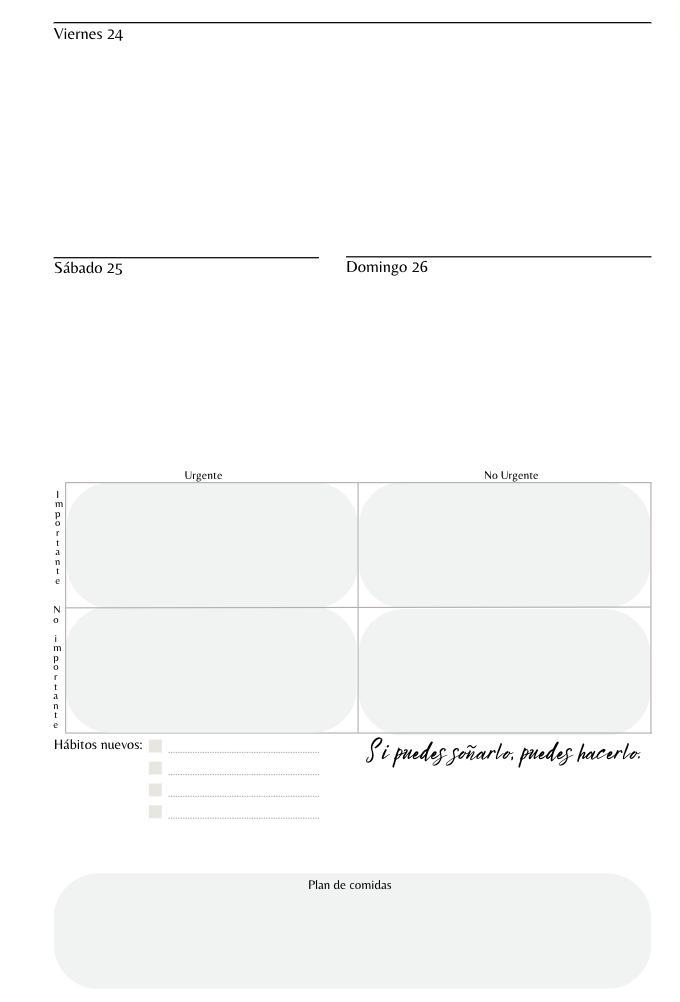 Un ligero planificador semanal y mensual que te permite organizar tu vida y tu negocio. Sin fechas, para que empieces cuando tú quieras. Diseño marrón tipo papel «Work in Proress». Incluye organización de tareas por orden de urgencia e importancia.